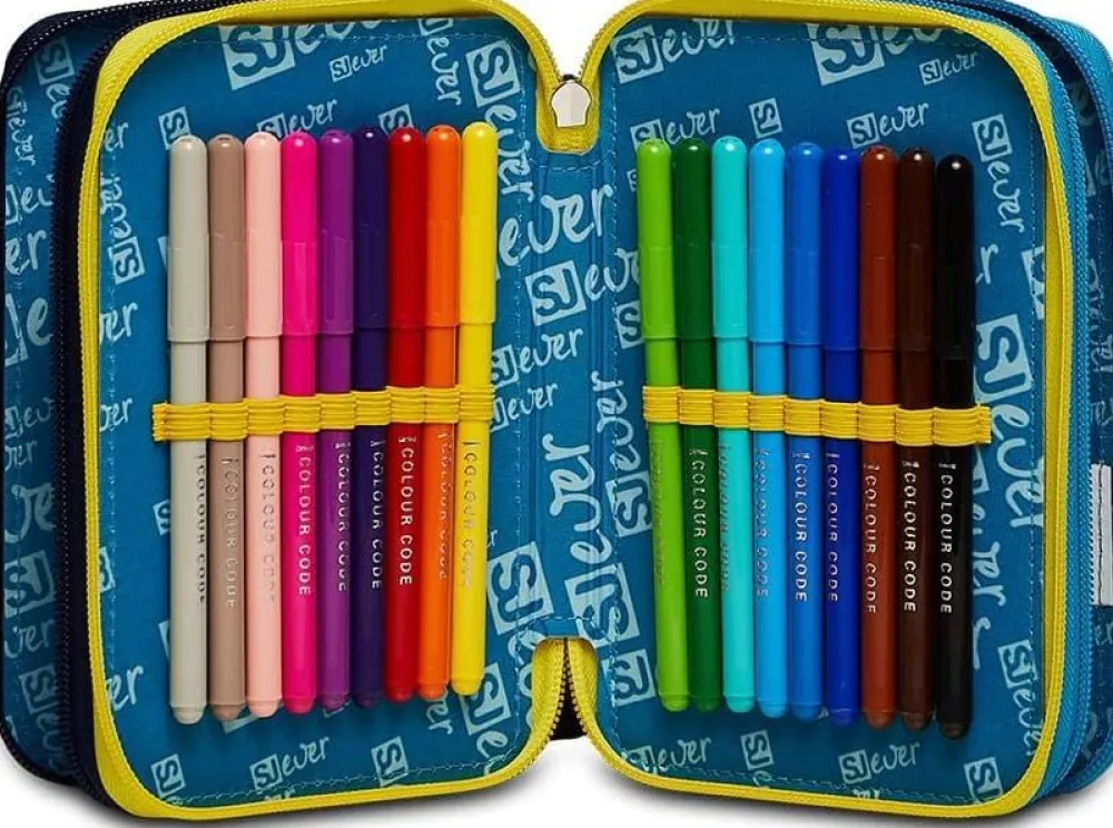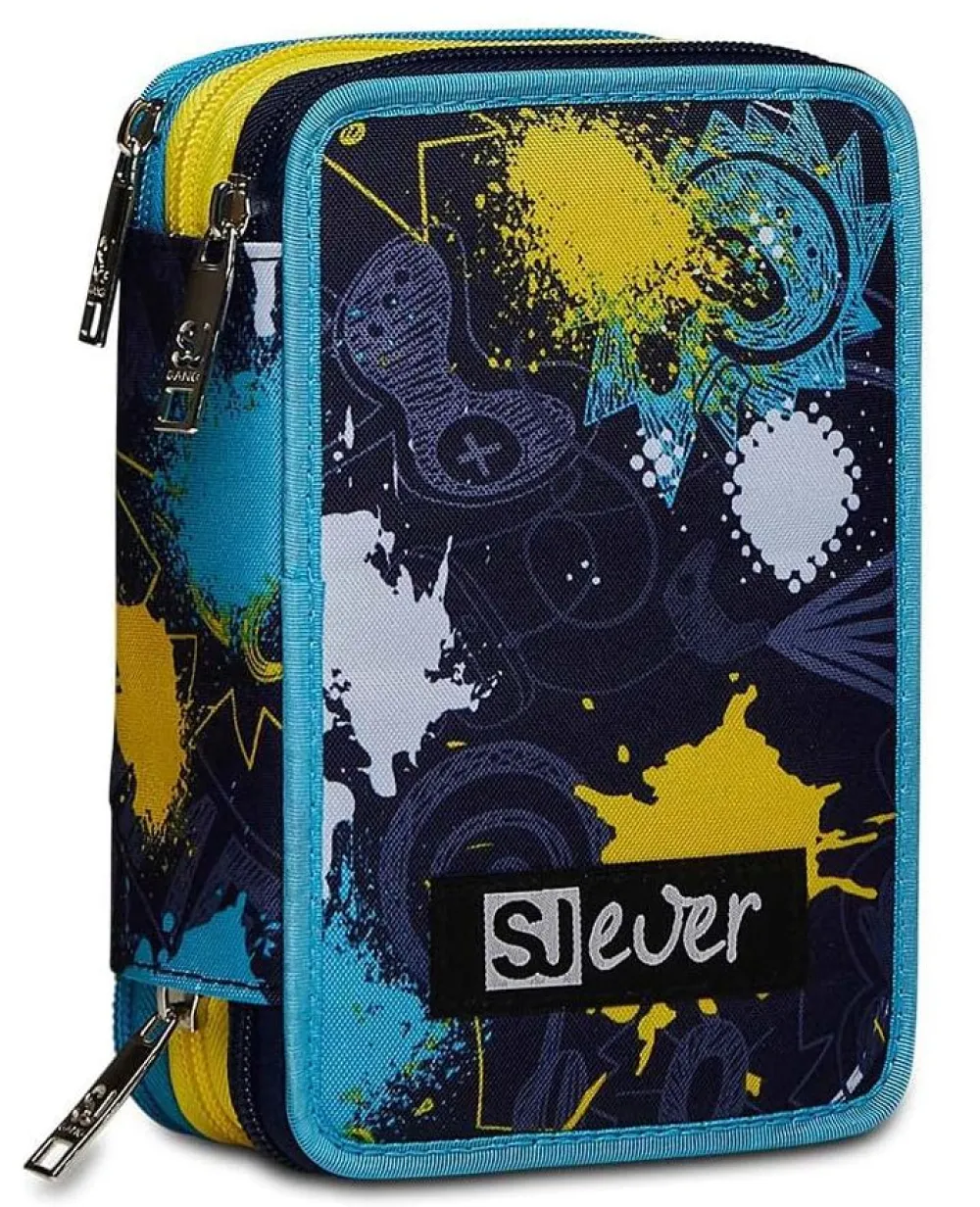 Astuccio per la scuola 3 zip SJ. Realizzato in robusto poliestere, con tre tasche principali chiuse da zip, complete di tutto l’occorrente per la scuola!
