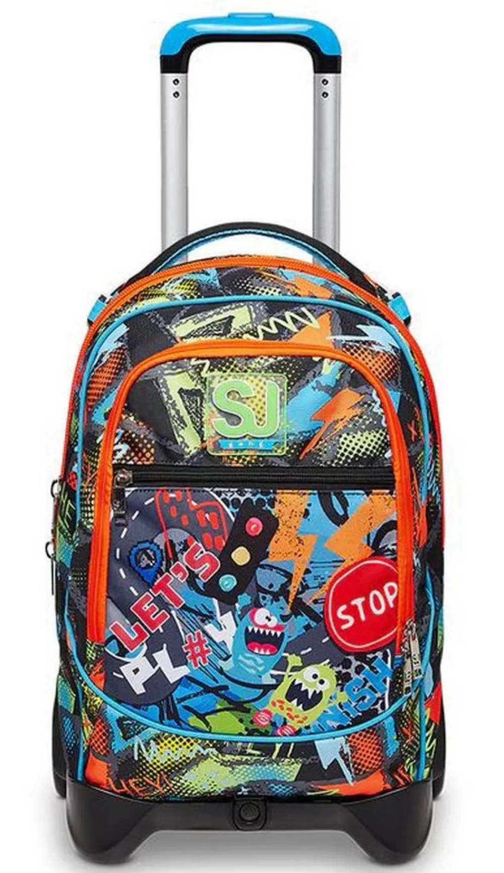 Trolley scuola SJ Jack 3 ruote. Zaino realizzato in robusto poliestere, schienale imbottito e rivestito in tessuto, spallacci imbottiti e traspiranti. Lo zaino Jack di SJ può essere comodamente sganciato dal carrello di traino in poche semplici mosse, per la pulizia o per la portabilità a zaino. Il carrello di traino è rinforzato con push botton, il fondo rigido e le grandi ruote gommate e silenziose garantiscono un trasporto semplice in ogni condizione. Dotato di sistema a 3 ruote per agevolare la salita dei gradini. Ampia tasca principale e tasca frontale chiuse da zip. Il Crossover System consente di trascinare il trolley senza sporcare gli spallacci: quando solleverai la barra telescopica di traino gli spallacci si alzeranno in maniera automatica!