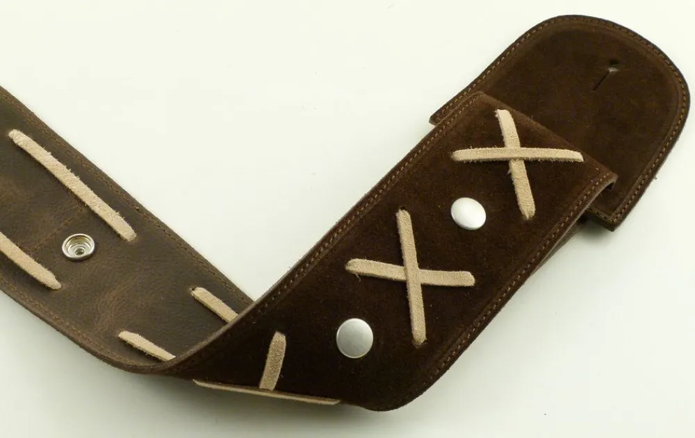 Tracolla replica della tracolla del mitico David Gilmour, realizzata accoppiando due materiali di grande resistenza e qualità . La parte superiore è realizzata in vera pelle scamosciata, con inserti ad “x†in contrasto, anch’essi in vera pelle. La parte posteriore è realizzata in vera pelle “effetto buccia d’aranciaâ€, che conferisce all’articolo grande resistenza senza compromettere le qualità di elasticità e morbidezza. La tracolla è comodamente regolabile in lunghezza mediante tre bottoni a pressione di colore nichel opaco.Il materiale usato per la realizzazione di questo articolo è vera pelle italiana. La qualità dei materiali è la nostra priorità e l’unico modo per realizzare un prodotto con caratteristiche di elevata resistenza, elasticità e morbidezza.Lunghezza : 115 – 127 cmSpessore : 2,5 mmLarghezza : 7 cm