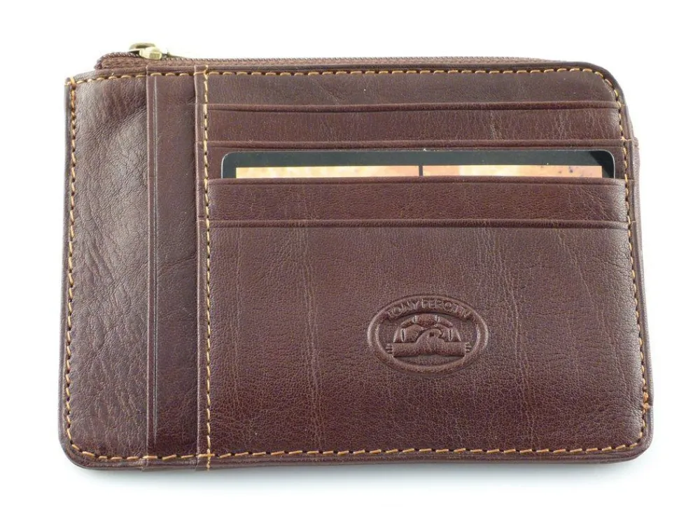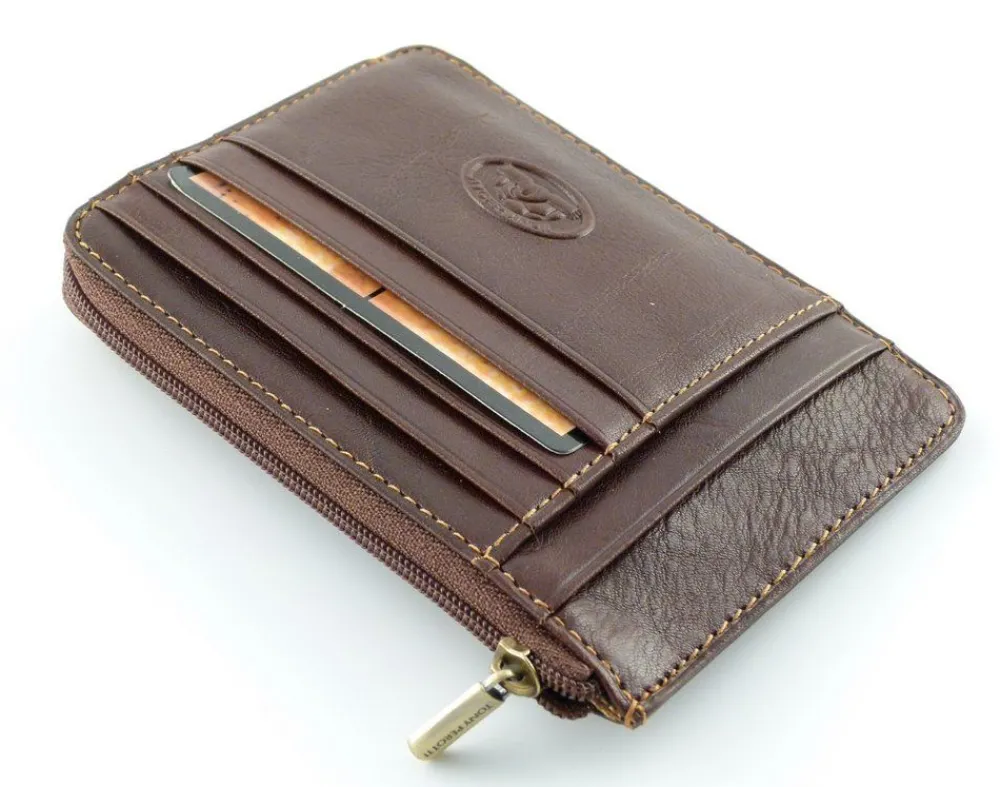 Portadocumenti piatto in cuoio, pratico e funzionale. La misura consente di inserire la carta d’identità e le carte di credito. La lampo nella parte superiore consente di inserire banconote e moneta senza il rischio di perderle.