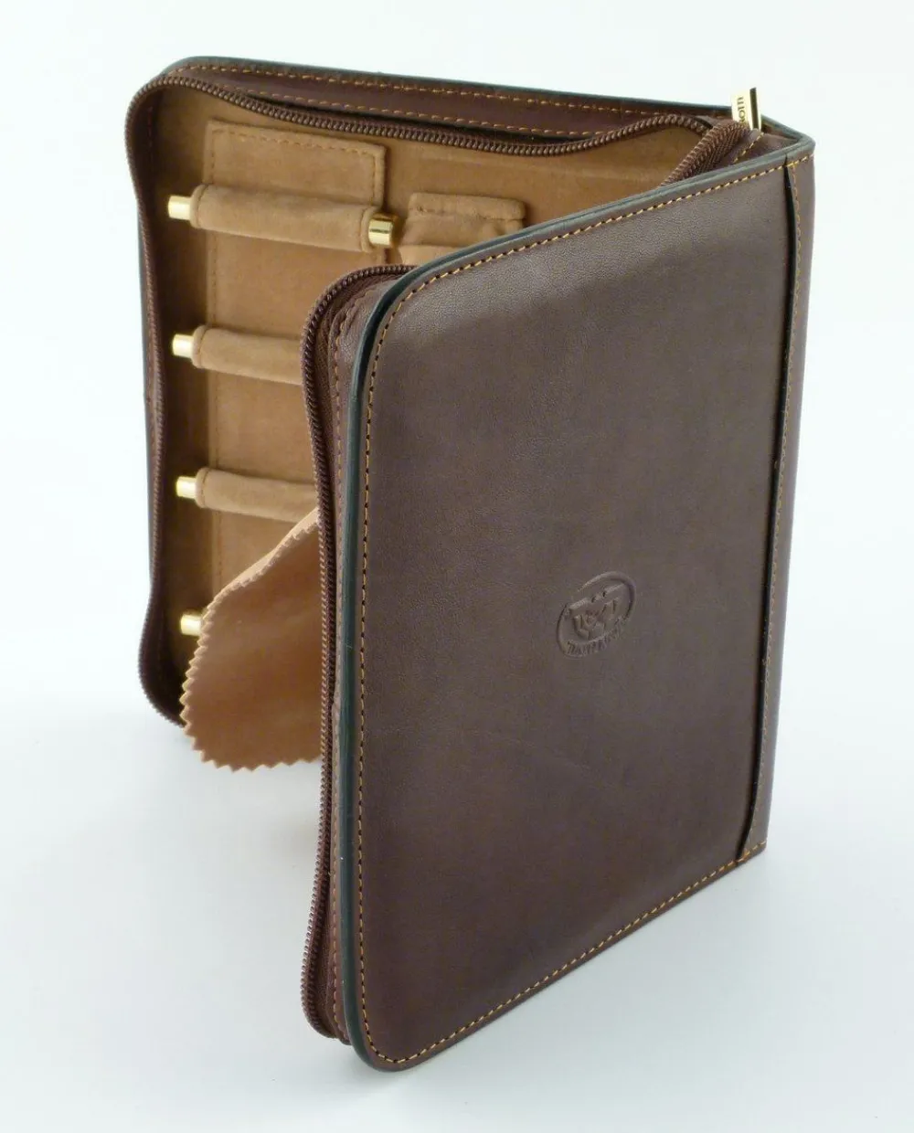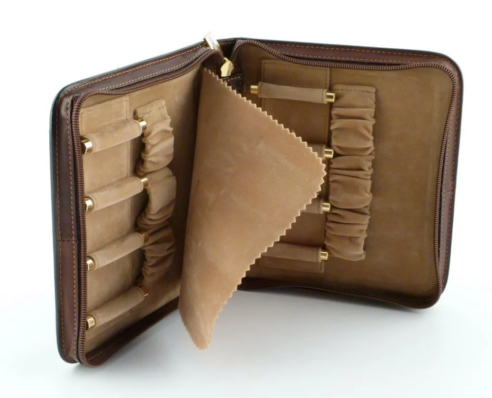 Portaorologi in cuoio della linea italiaco di Tony Perotti. Realizzato in cuoio fiorentino può contenere fino a 6 orologi. Il pratico divisorio centrale permette di riporre in tutta tranquillità gli orologi, senza il rischio di rigarne il frontale. Chiusura laterale con lampo.