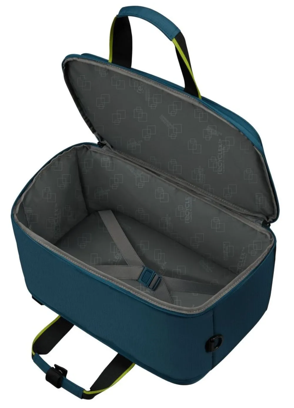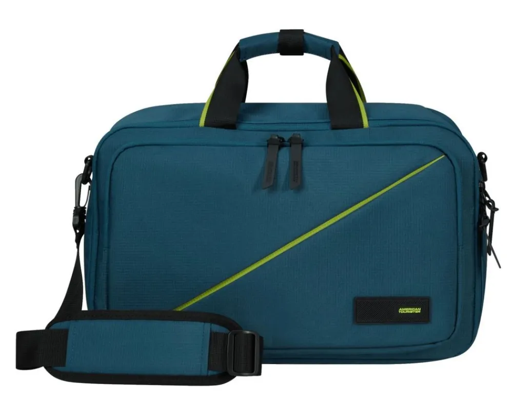 Borsa cabina zaino 40x20x25 American Tourister Take2Cabin. Borsa cabina realizzata in robusto poliestere riciclato, ampia tasca principale chiusa da zip con nastri per bloccare l’abbigliamento. Tasca frontale chiusa da zip, tracolla amovibile, passante asta trolley posteriore per bloccare la borsa al bagaglio principale. Garanzia 2 anni.