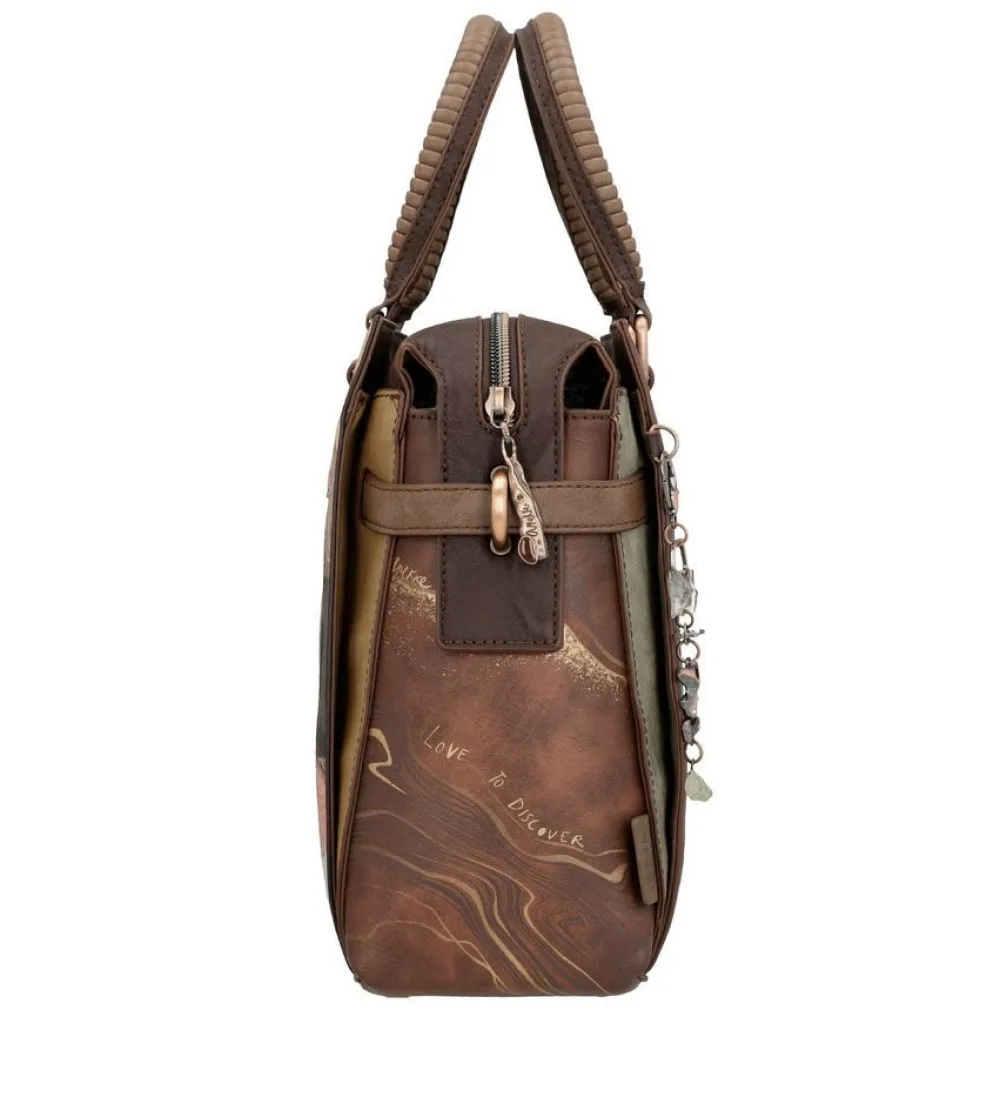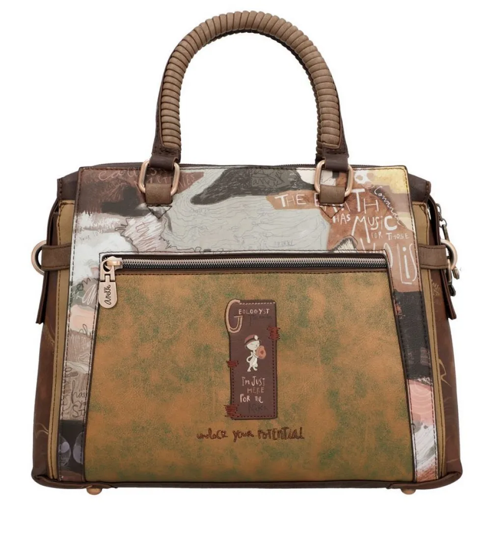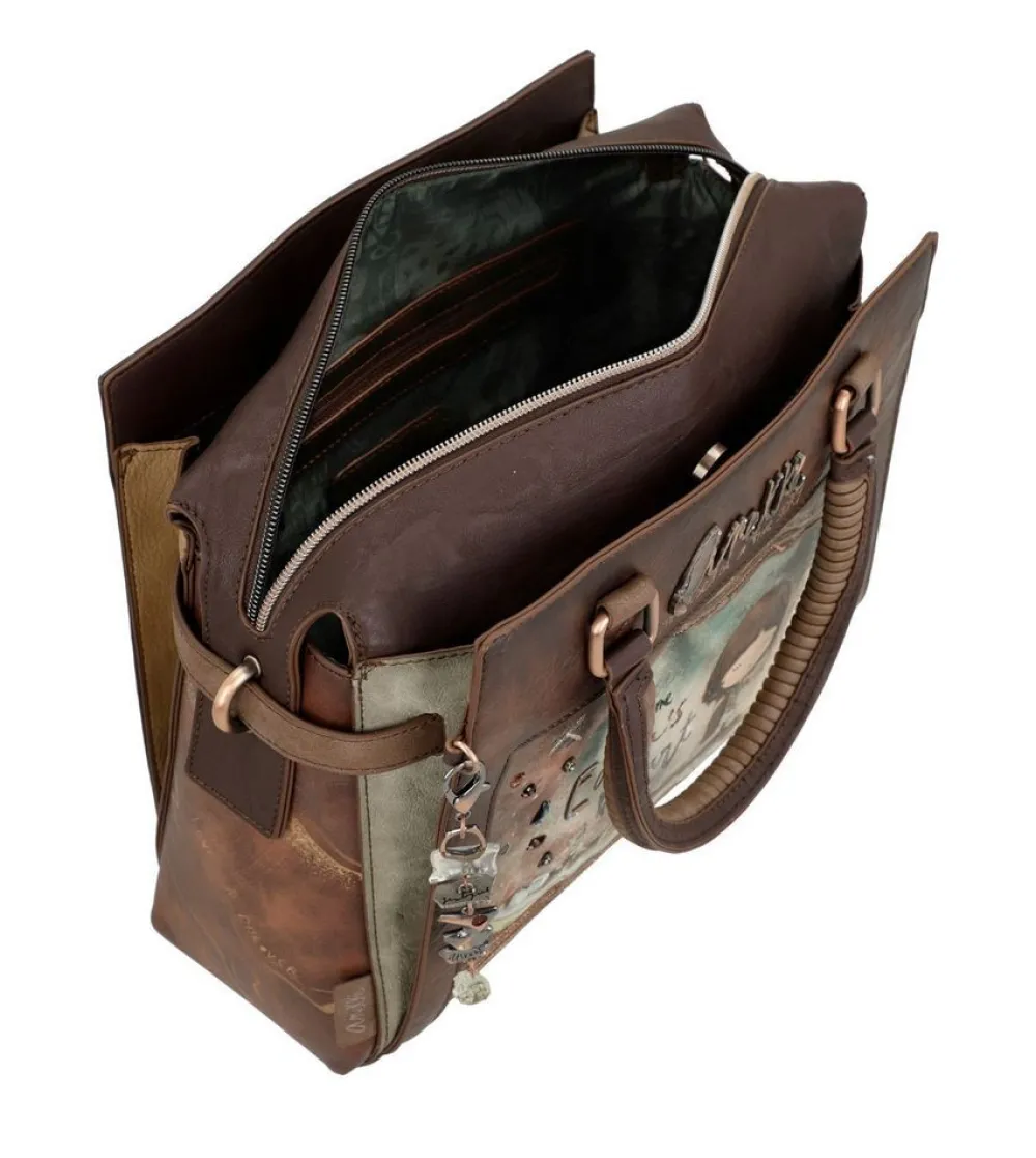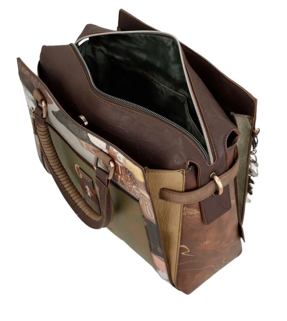 Borsa due manici Anekke Outer 39811-189. Borsa con doppia maniglia superiore, ampia tasca principale con chiusura a zip, tasche interne per piccoli oggetti. Tasca posteriore chiusa da zip. Tracolla amovibile e regolabile in lunghezza. Tutti gli accessori, come tiralampo e borchie, sono personalizzate Anekke.
