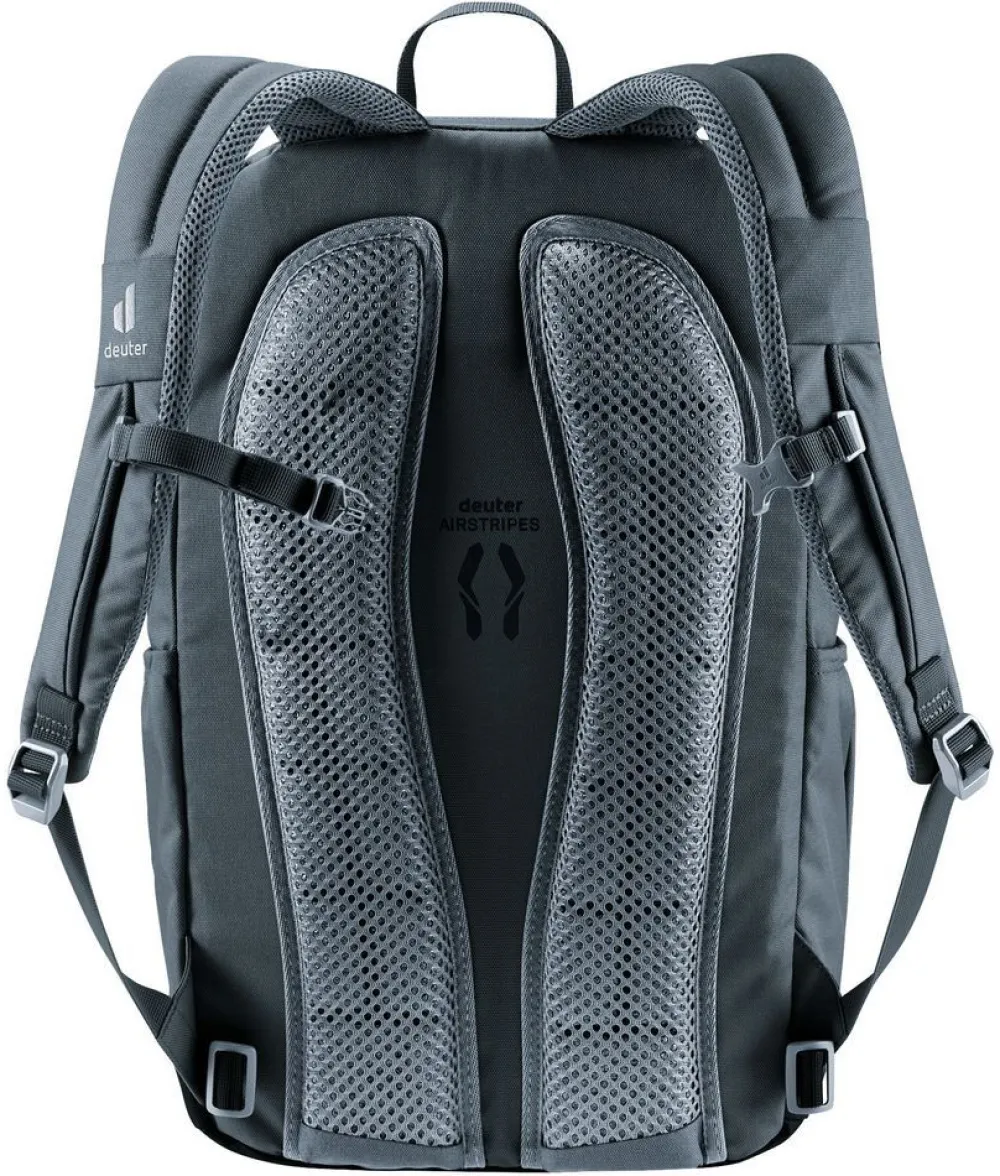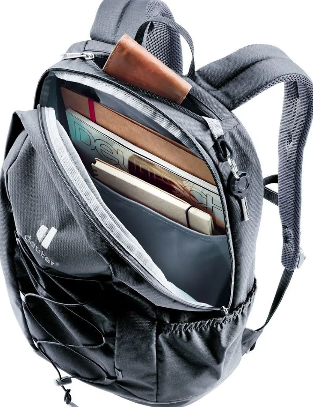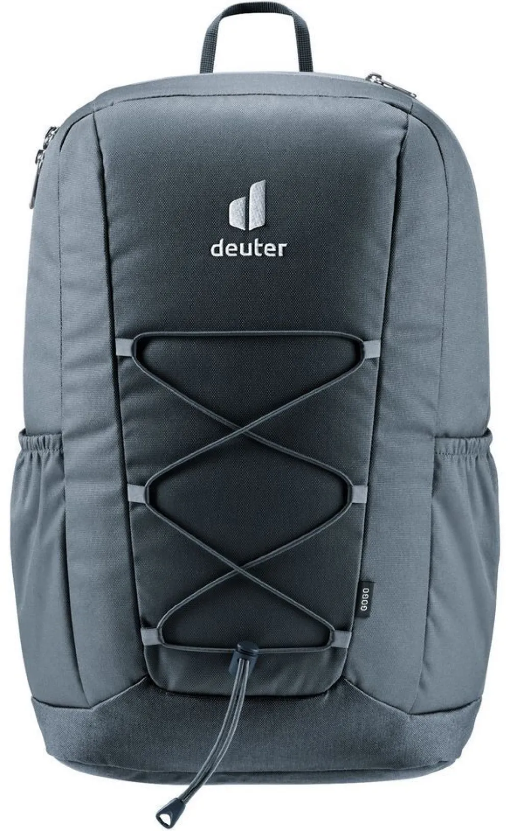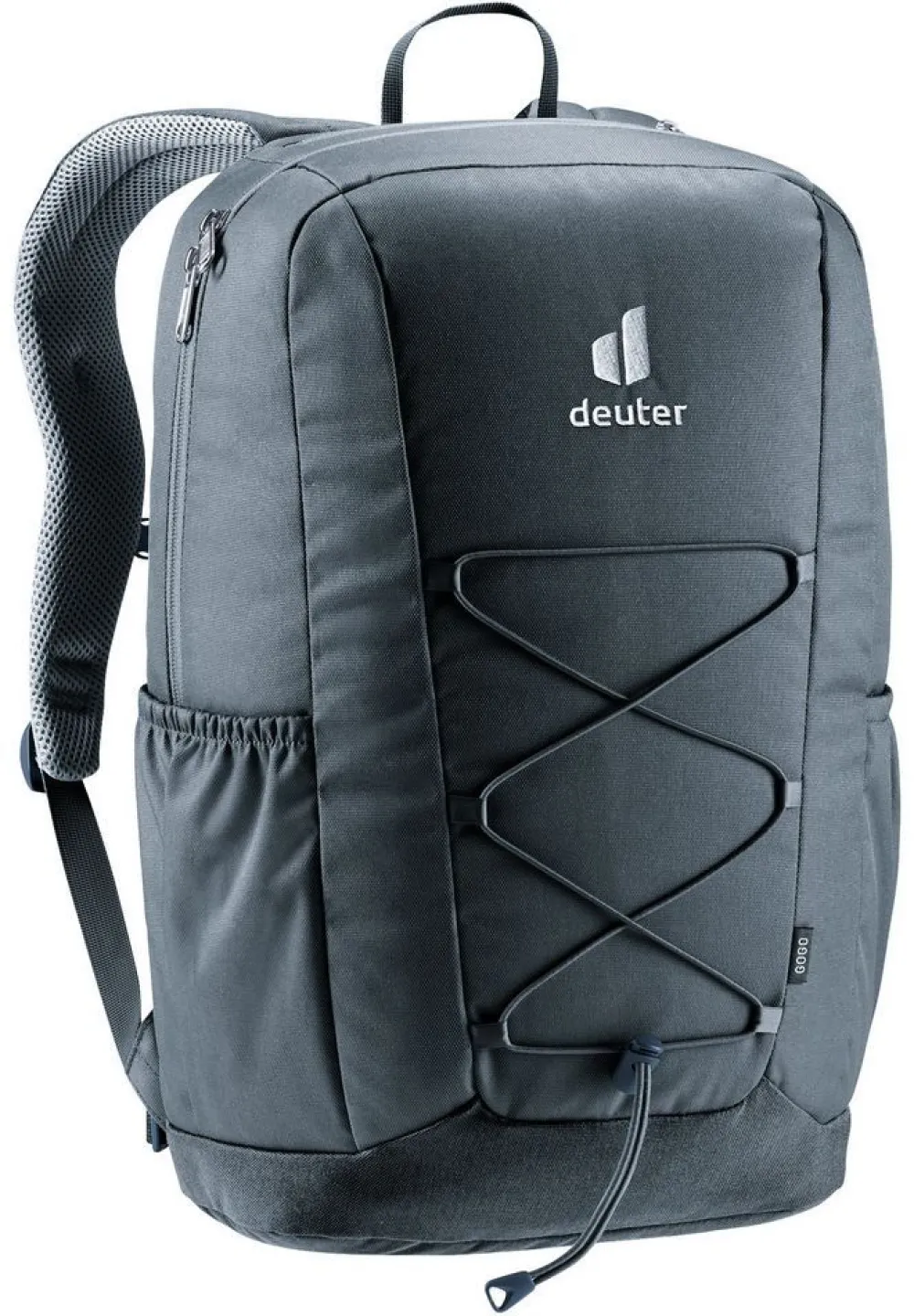 Zaino Deuter Gogo. Zaino realizzato in robusto poliestere, ampia tasca principale chiusa da zip, schienale imbottito e traspirante Deuter Airstripes, spallacci gommati e sagomati. Ampia tasca frontale e tasche laterali, per bottiglia e ombrello.