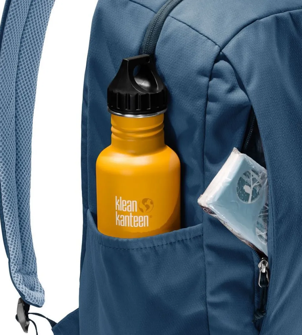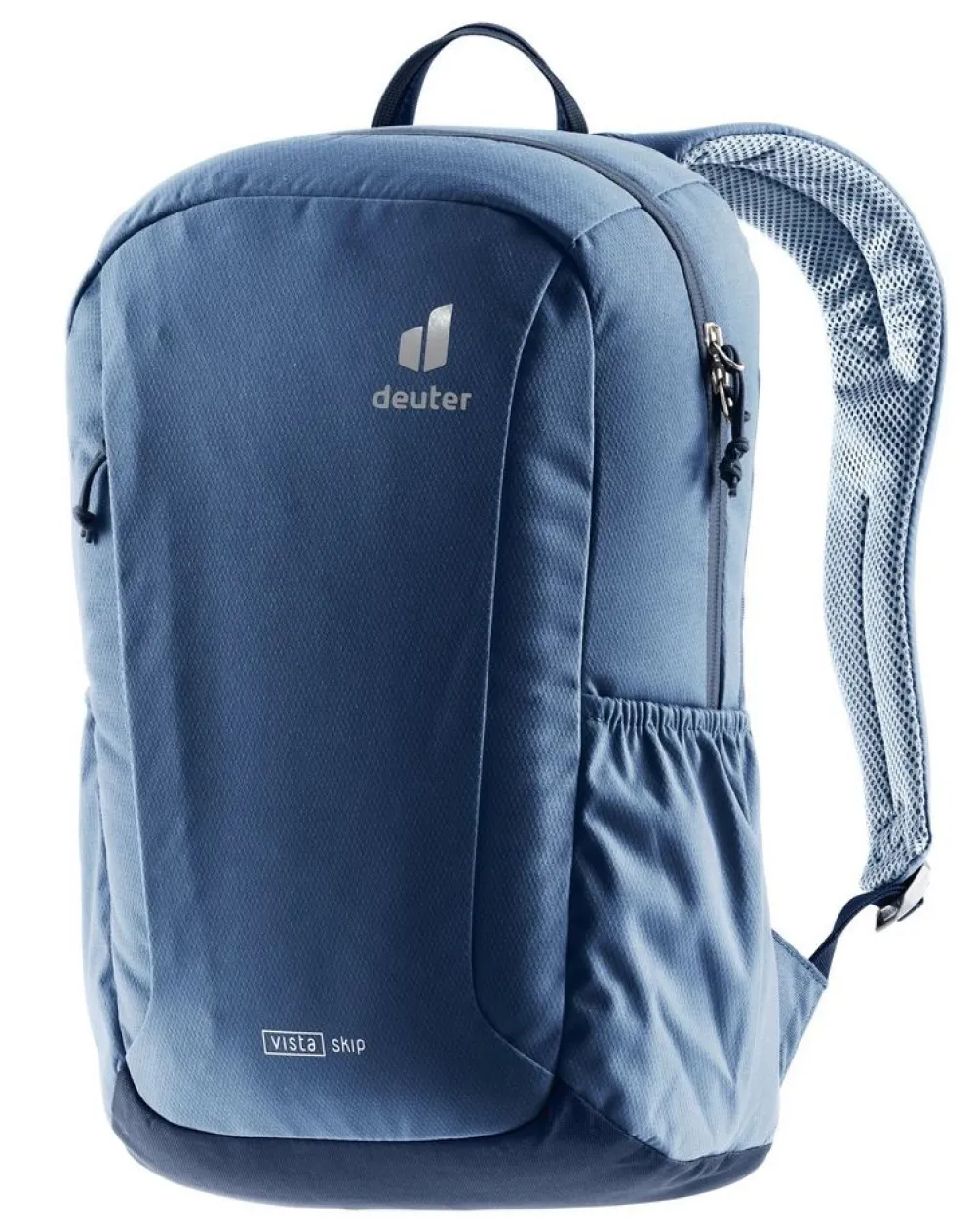 Zaino Deuter Vista Skip. Zaino realizzato in robusto tessuto 100% riciclato, ampia tasca principale chiusa da zip, schienale imbottito e traspirante, spallacci gommati e sagomati. Tasca frontale e tasche laterali, per bottiglia e ombrello.