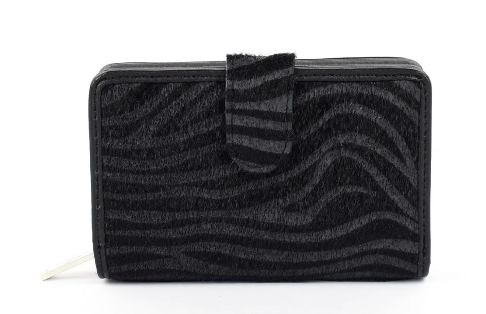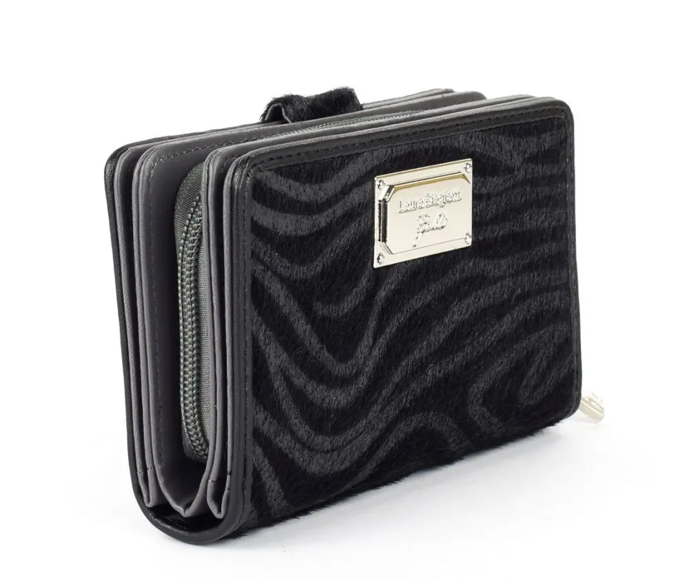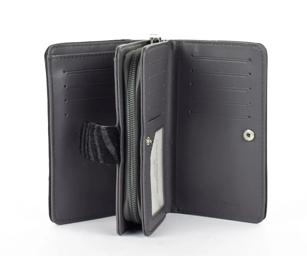 Portafoglio donna Laura Biagiotti Gold Jitters. Doppio vano frontale e posteriore per documenti e banconote, chiuse con bottone. Tasca centrale chiusa da zip. Logo frontale.