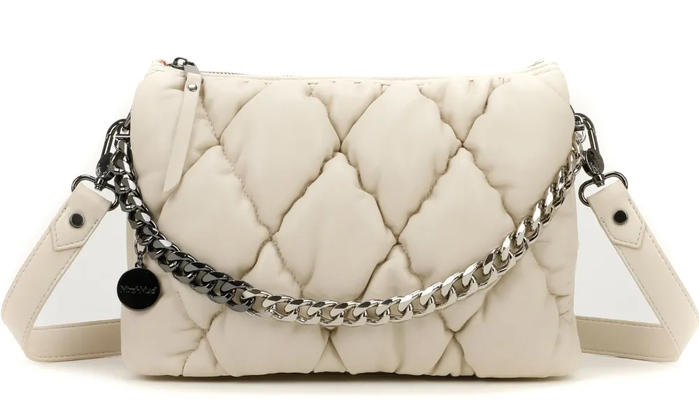 Borsa a tracolla Mimì-Muà . Borsa realizzata in robusto materiale sintetico. Ampia tripla tasca principale chiusa da zip, tasca interna chiusa da zip e tasche per piccoli oggetti. Tracolla regolabile in lunghezza.