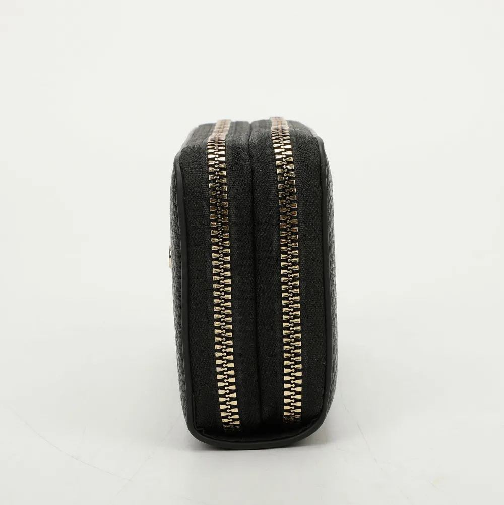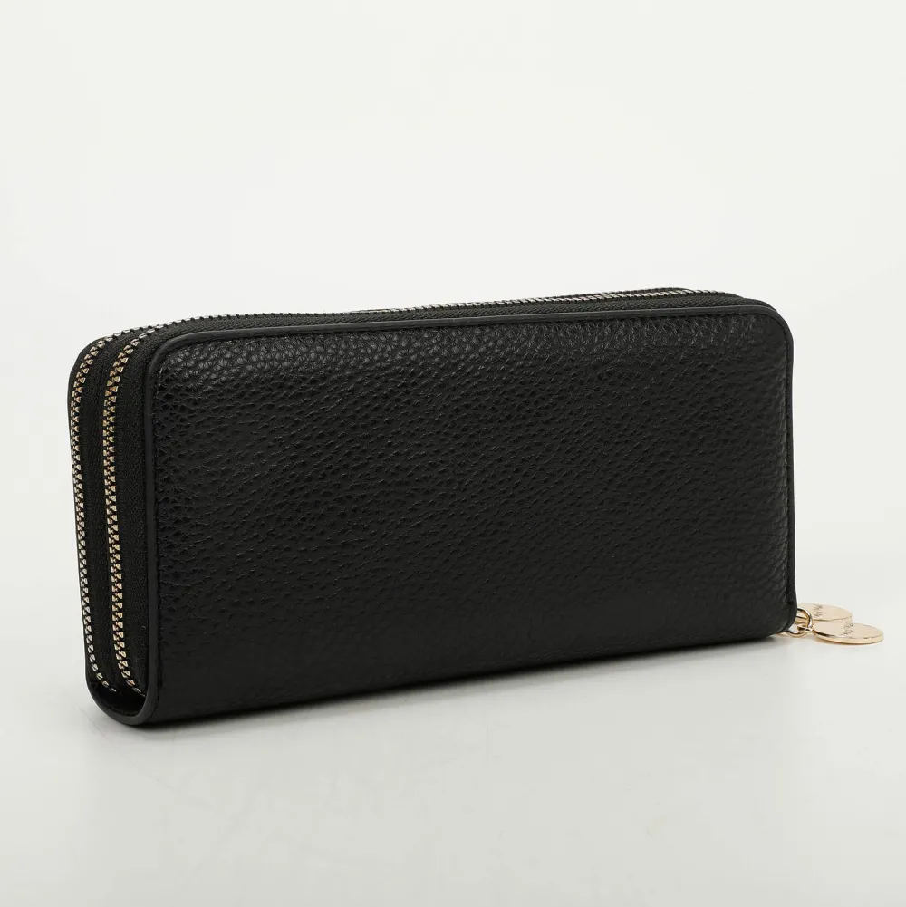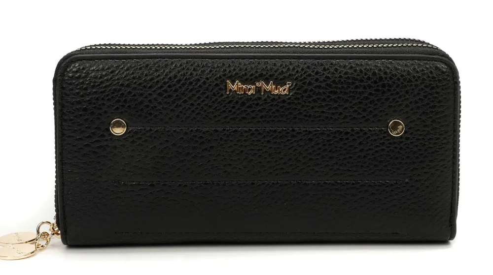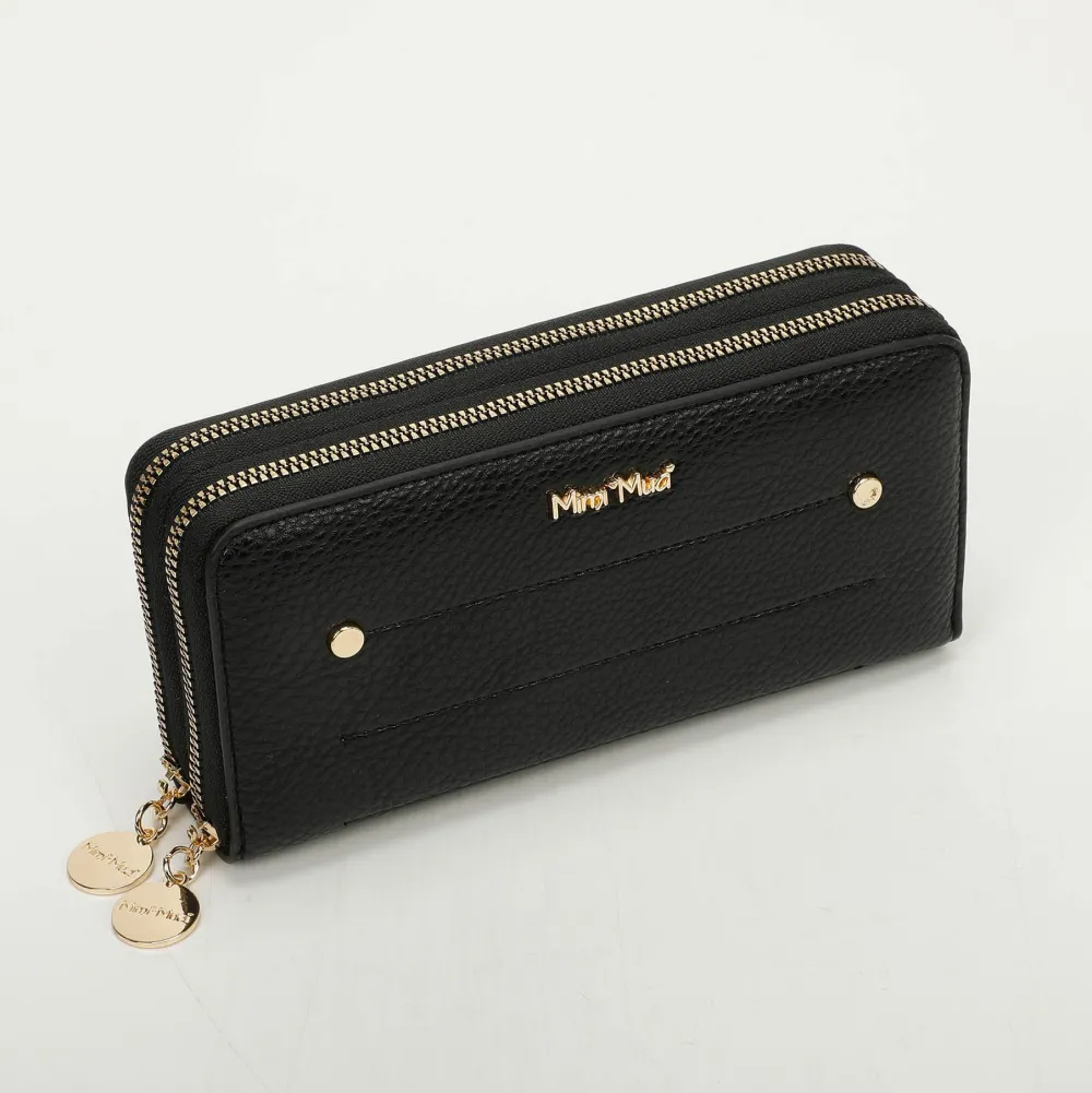 Portafoglio donna 2-zip Mimì-Muà . Realizzato in robusta pelle sintetica, due ampie tasche principali chiuse da zip con vano per banconote e tasca chiusa da zip per monete.