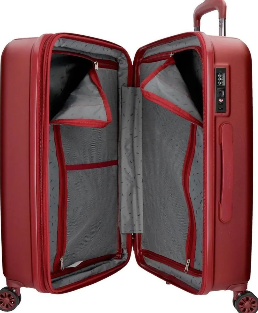 Trolley medio espandibile Movom Wood. Trolley realizzato in robusto ABS, quattro grandi e silenziose ruote piroettanti, sistema di sicurezza a tripla combinazione e TSA per gli Stati Uniti. Carrello di traino con push botton, maniglia di servizio laterale e superiore. Interno completamente foderato, con doppio divisorio per bloccare l’abbigliamento e divisorio. Zip di espansione. Garanzia 2 anni.
