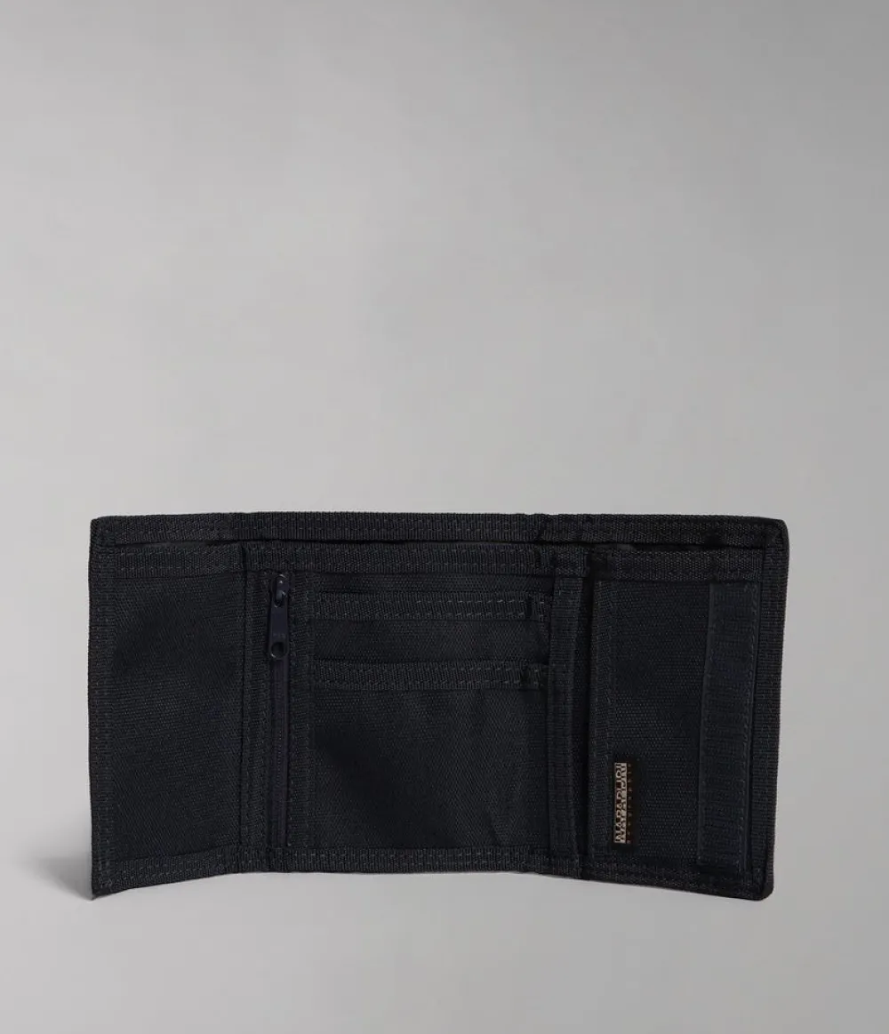 Portafoglio Napapijri Happy Wallet 4. Realizzato in robusto poliestere, con chiusura a strap, vano porta banconote e portadocumenti interno. Tasca portamonete chiusa da zip.