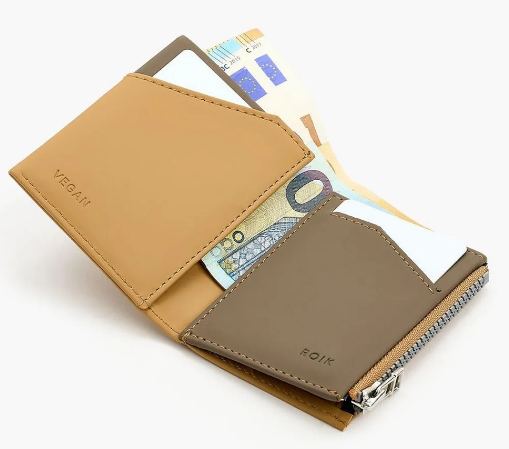 Portafoglio sottile ROIK Zip Coin Vegan. Realizzato in pelle vegana di alta qualità , spazio per conservare fino a 9 carte, protezione RFID nelle tasche interne. Il vano principale consente di inserire banconote senza doverle piegare (fino al taglio 50 €). La tasca esterna ad accesso rapido consente di inserire tre carte di uso frequente. Tasca esterna chiusa da zip per moneta o chiavi. Garanzia 3 anni.