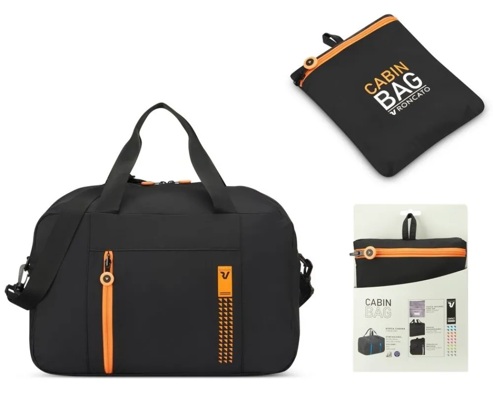 Borsa cabina pieghevole 40x25x20 Roncato Compact 2011. Borsa cabina realizzata in robusto poliestere, ampia tasca principale chiusa da zip, tasca frontale chiusa da zip. Tracolla amovibile e regolabile in lunghezza. La borsa cabina ideale per i voli Ryanair (bagaglio a mano senza priorità 40x25x20 cm) con una capacità utile di ben 23 L! Garanzia 3 anni.