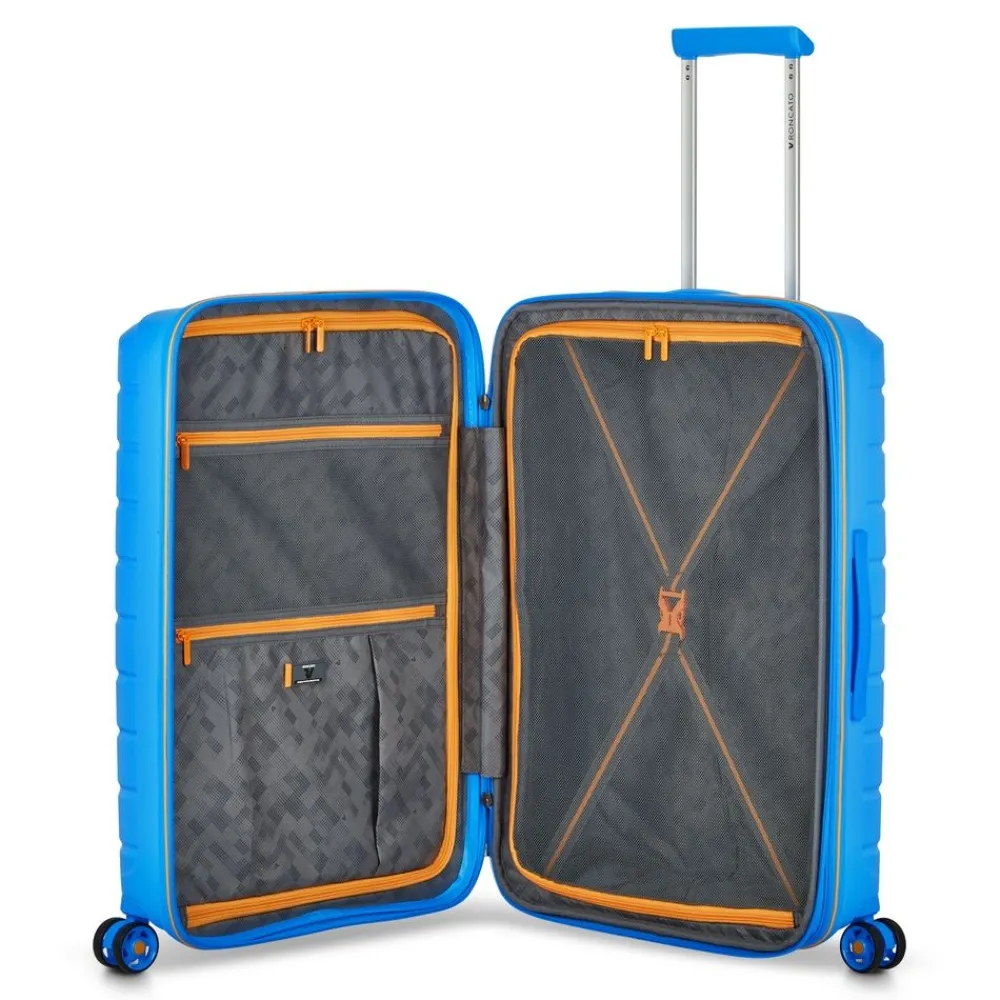 Trolley espandibile Roncato B-Flying medio 8182. Trolley realizzato in robusto Polipropilene ultraleggero, 4 ruote doppie piroettanti per la massima manovrabilità , carrello di traino telescopico con push botton, chiusura a tripla combinazione con sistema TSA per gli Stati Uniti, zip di espansione che consente di aumentare la capacità a seconda delle necessità . Interno completamente foderato con divisorio e tasche per piccoli oggetti. Garanzia 2 anni.