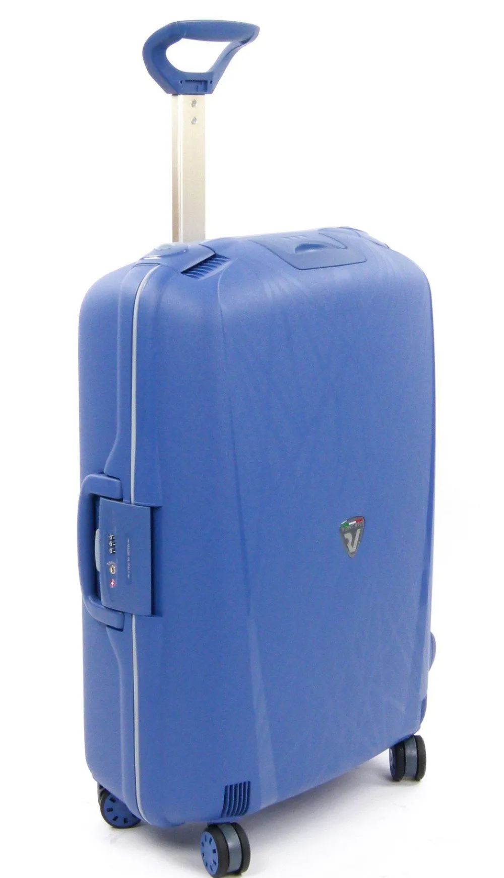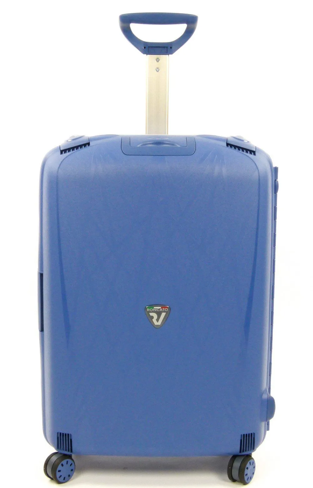 Trolley Roncato Light 4 ruote medio. Trolley in polipropilene ultraleggero realizzato interamente in Italia, con maniglia di traino integrata con sistema “push botton”, 4 ruote piroettanti, maniglia superiore integrata, interno accessoriato con divisorio e tasche per piccoli oggetti, sistema di sicurezza altamente resistente (composto da 3 chiusure con blocco di sicurezza e una combinazione centrale dotata di sistema TSA per i Vostri viaggi negli Stati Uniti). I motivi grafici sul frontale del trolley ricordano una ragnatela e sono il frutto di una ricerca specifica da parte dell’azienda produttrice. Durante il processo produttivo il polipropilene viene iniettato all’interno dello stampo in maniera sequenziale, riducendo così lo spessore della plastica (e quindi il peso) e garantendo grandi doti di elasticità e resistenza. Un occhio attento anche alla salvaguardia dell’ambiente. Il trolley è riciclabile al 100% ed è costruito utilizzando un sistema di produzione e assemblaggio studiato per ridurre l’emissione di CO2 nell’ambiente. Test effettuati sul prodotto: Test di caduta : a pieno carico – Test di tamburo : 20 rotazioni a pieno carico – Ruote : 32.000m a pieno carico – Serrature : 7.500 aperture/chiusure – Maniglie : 5000 cicli a pieno caricoÂ
