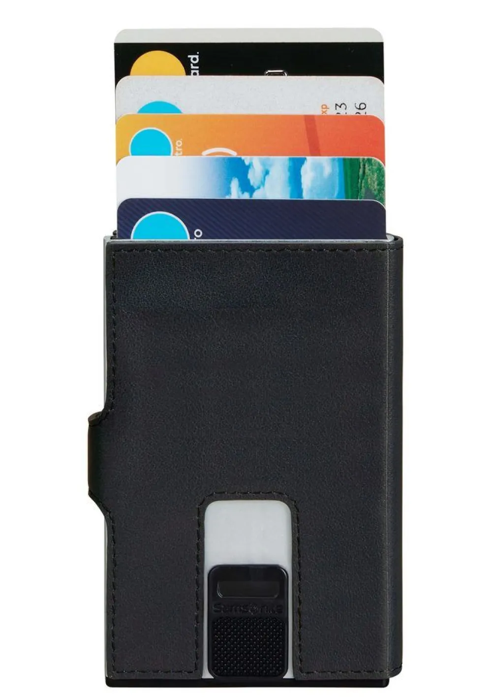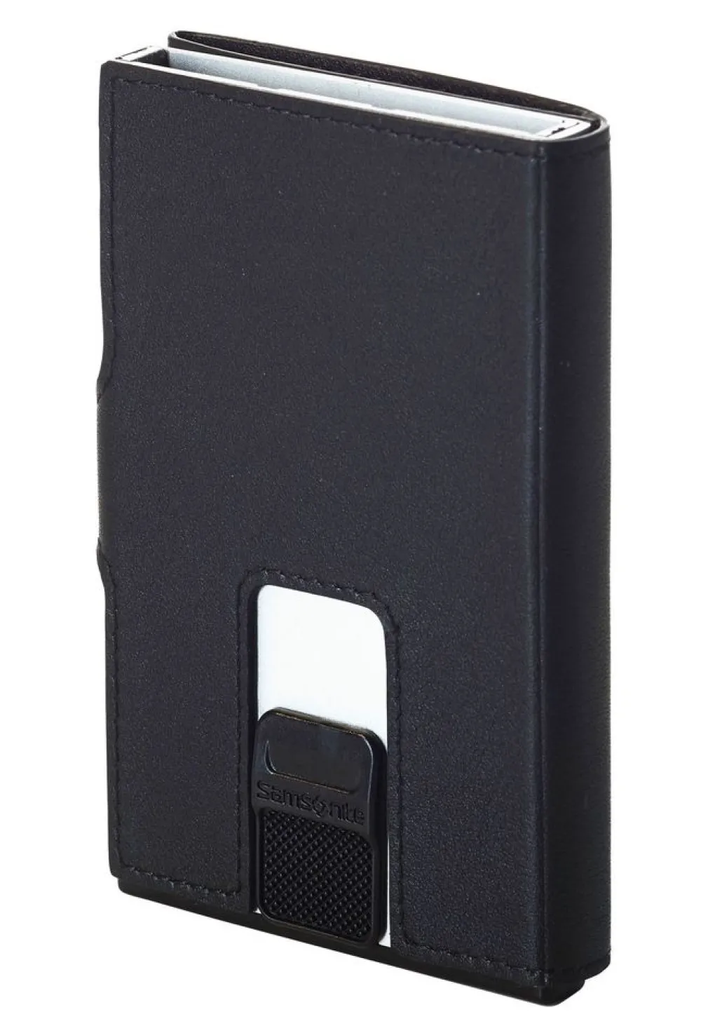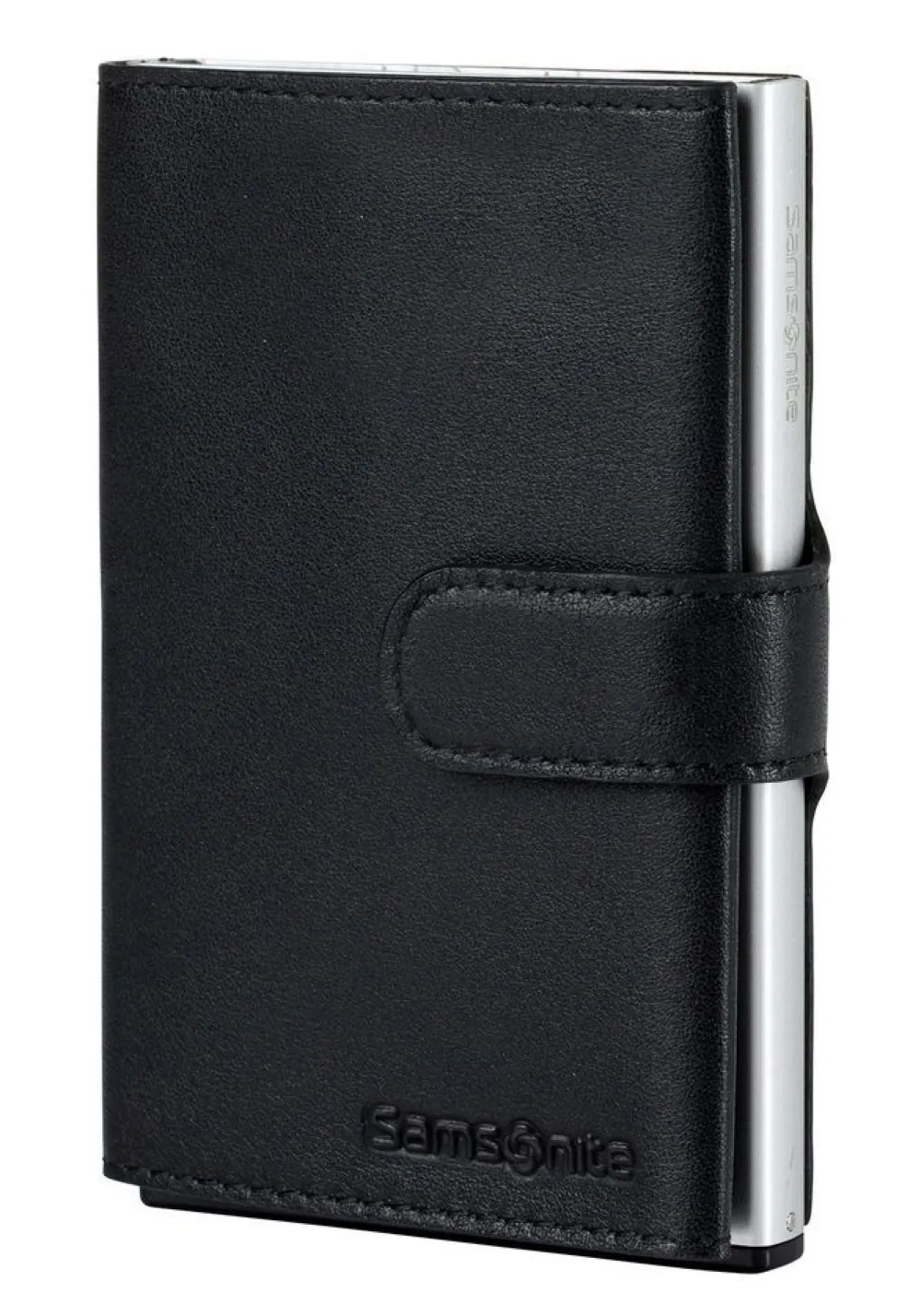Portafoglio uomo piccolo Samsonite Alu Fit. Realizzato in pelle di alta qualità , con corpo porta carte di credito in alluminio, accesso rapido per estrarre le carte senza aprire il portafoglio, vano portabanconote. Schermatura RFID.