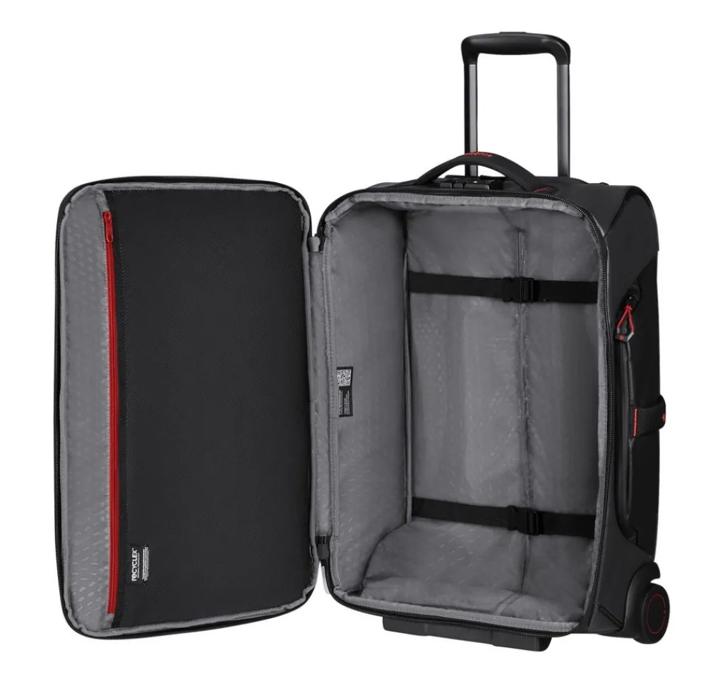 Trolley cabina Samsonite Ecodiver. Trolley cabina realizzato in robusto materiale gommato, 100% riciclato PET e resistente all’acqua. Due grandi e silenziose ruote integrate, sistema di sicurezza a tripla combinazione e TSA per gli Stati Uniti. Carrello di traino bitubo regolabile in altezza con push botton, maniglie di servizio superiore, laterale e frontali. Interno con nastri per bloccare l’abbigliamento e tasca per piccoli oggetti. Porta indirizzo integrato. Garanzia 5 anni.
