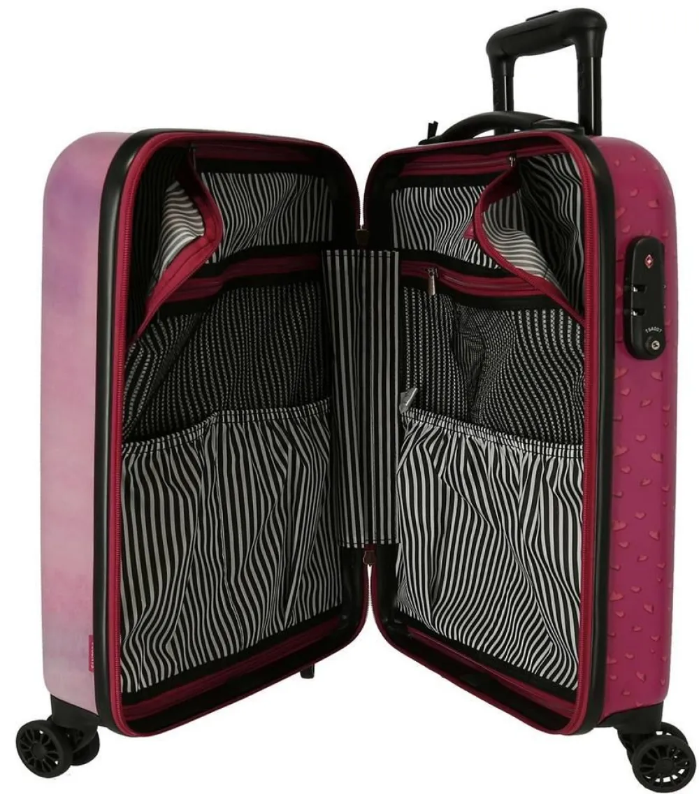 Trolley cabina Santoro Gorjuss For My Love. Trolley cabina realizzato in robusto ABS, quattro grandi e silenziose ruote piroettanti, zip di chiusura con sistema di sicurezza a tripla combinazione TSA per gli Stati Uniti. Carrello di traino regolabile in altezza con push botton. Interno completamente foderato, con doppio divisorio. Garanzia 2 anni.