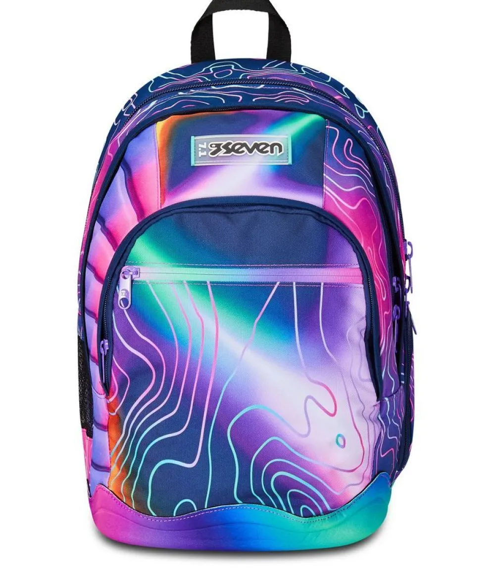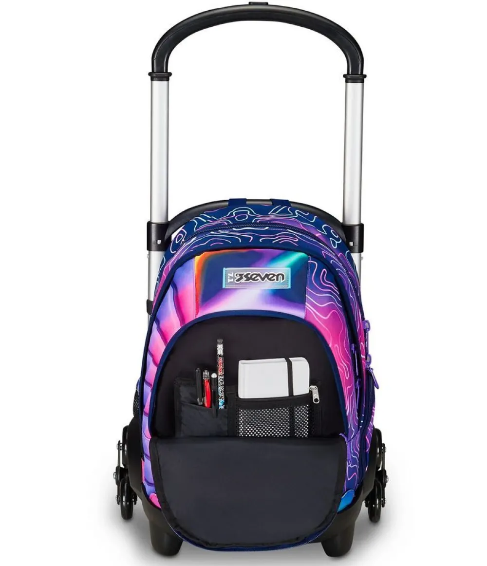 Trolley scuola 3 ruote Seven Flex. Zaino realizzato in robusto poliestere, schienale imbottito e rivestito in tessuto, spallacci imbottiti e traspiranti. Lo zaino Flex di Seven può essere comodamente sganciato dal carrello di traino in poche semplici mosse, per la pulizia o per la portabilità a zaino. Il fondo è rinforzato con protezioni angolari. Il Maxi carrello di traino è rinforzato con push botton e le tre ruote garantiscono la massima comodità anche sui gradini. Due ampie tasche principali e una tasca frontale, chiuse da zip. Il Crossover System consente di trascinare il trolley senza sporcare gli spallacci: quando solleverai la barra telescopica di traino gli spallacci si alzeranno in maniera automatica! Garanzia 2 anni.