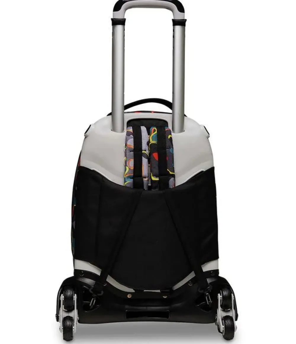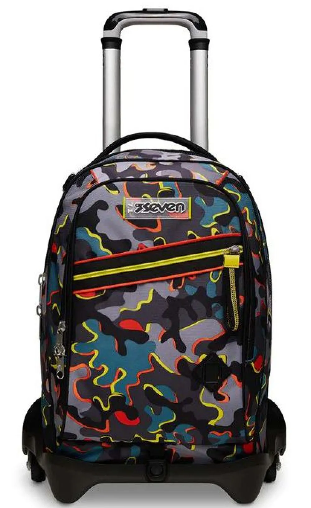 Trolley scuola Seven Jack 3 ruote. Zaino realizzato in robusto poliestere, schienale imbottito e rivestito in tessuto, spallacci imbottiti e traspiranti. Lo zaino Jack di Seven può essere comodamente sganciato dal carrello di traino in poche semplici mosse, per la pulizia o per la portabilità a zaino. Il carrello di traino è rinforzato con push botton, il fondo rigido. Ampia tasca principale e tasca frontale chiuse da zip. Il Crossover System consente di trascinare il trolley senza sporcare gli spallacci: quando solleverai la barra telescopica di traino gli spallacci si alzeranno in maniera automatica! L’innovativo sistema a 3 ruote consente di superare anche i gradini, senza sollevare lo zaino!