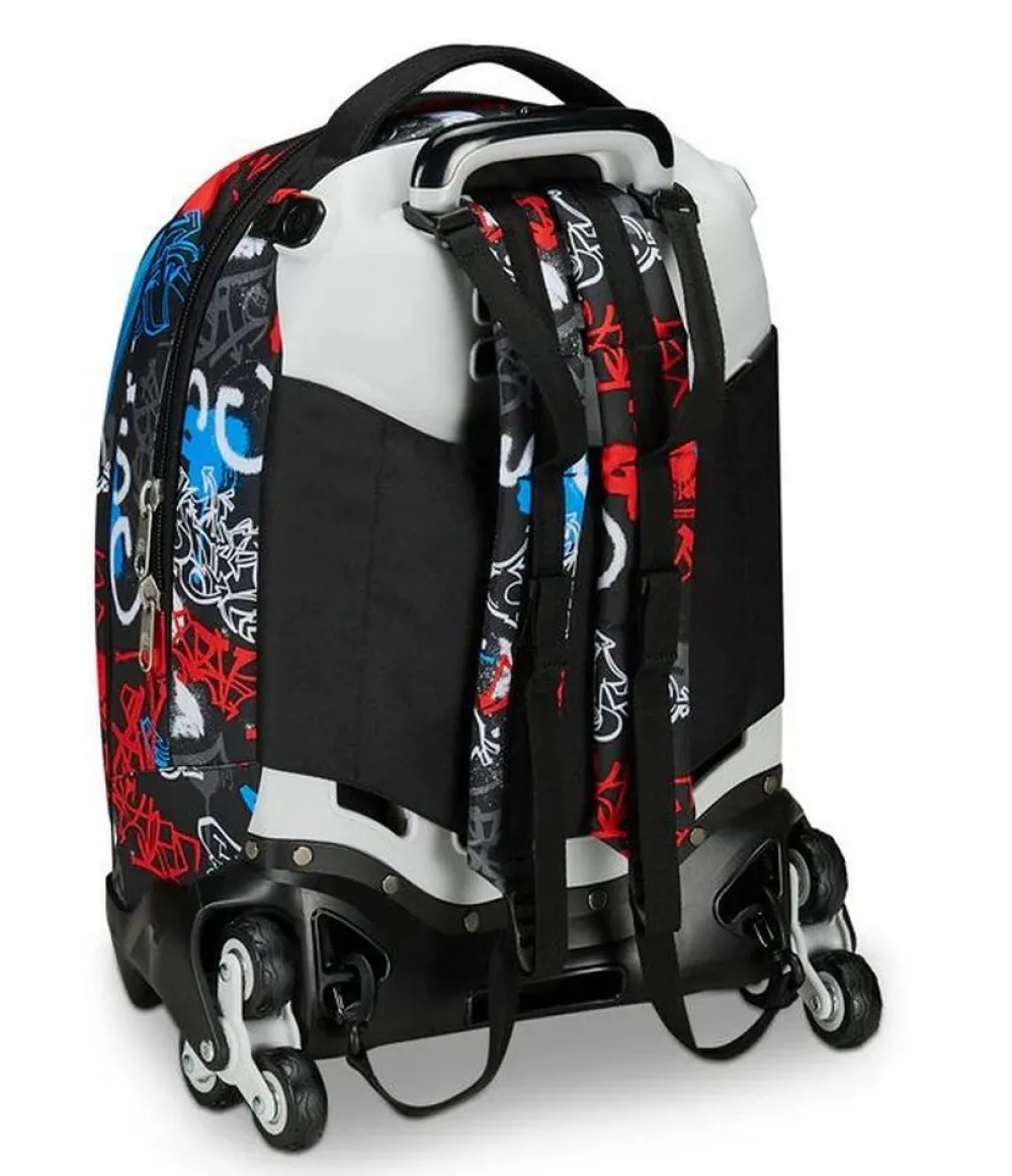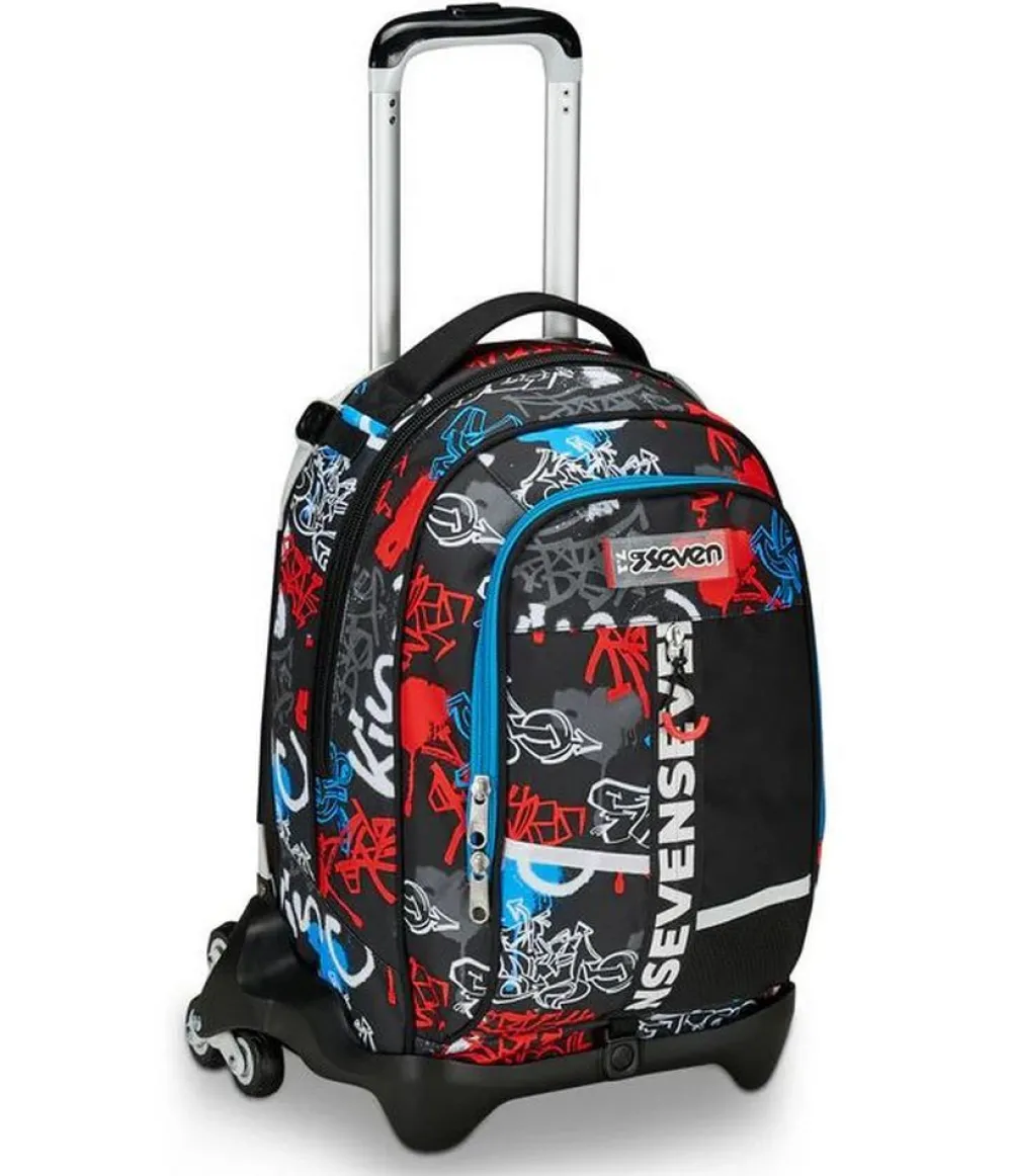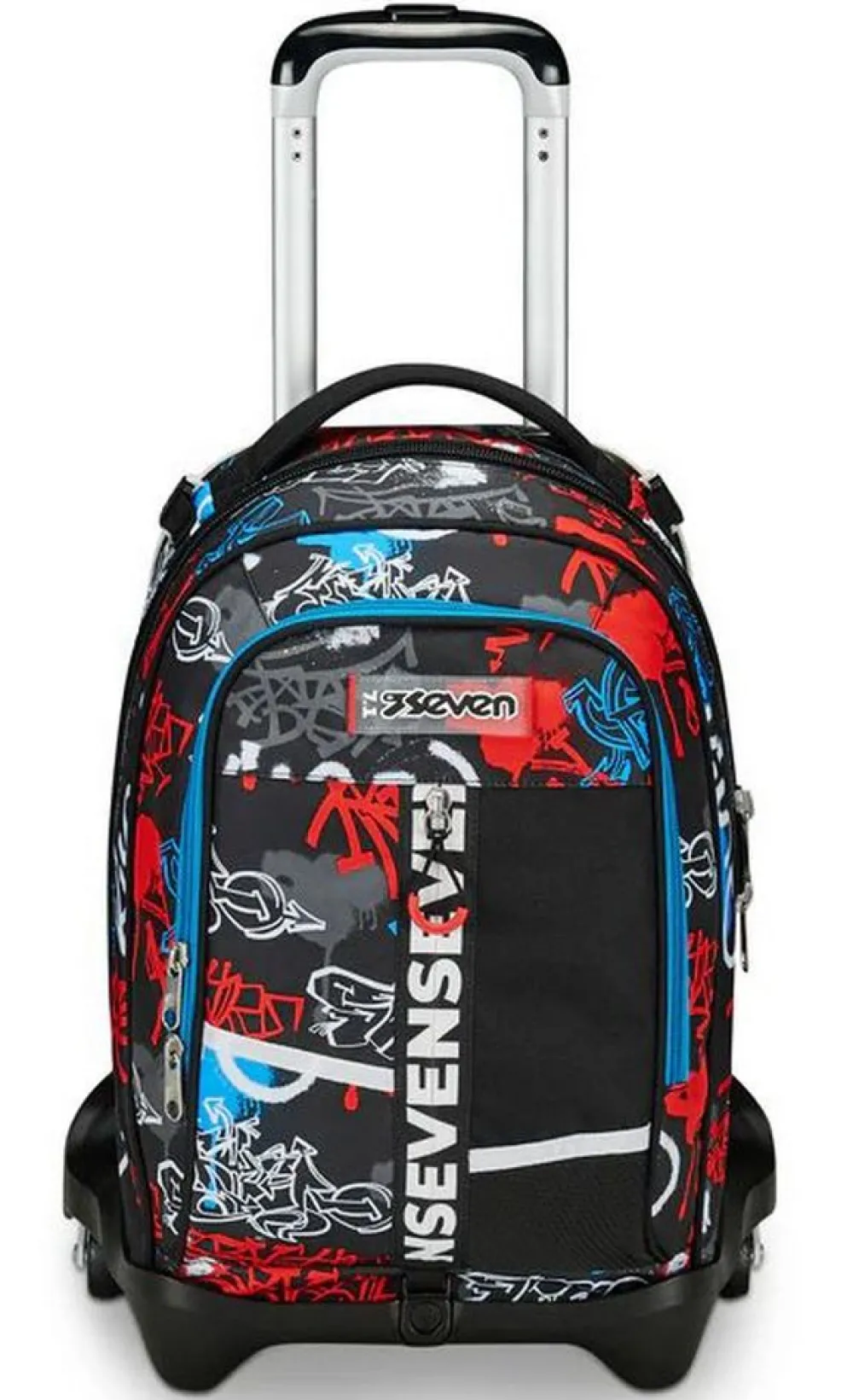 Trolley scuola Seven Jack 3 ruote. Zaino realizzato in robusto poliestere, schienale imbottito e rivestito in tessuto, spallacci imbottiti e traspiranti. Lo zaino Jack di Seven può essere comodamente sganciato dal carrello di traino in poche semplici mosse, per la pulizia o per la portabilità a zaino. Il carrello di traino è rinforzato con push botton, il fondo rigido. Ampia tasca principale e tasca frontale chiuse da zip. Il Crossover System consente di trascinare il trolley senza sporcare gli spallacci: quando solleverai la barra telescopica di traino gli spallacci si alzeranno in maniera automatica! L’innovativo sistema a 3 ruote consente di superare anche i gradini, senza sollevare lo zaino!