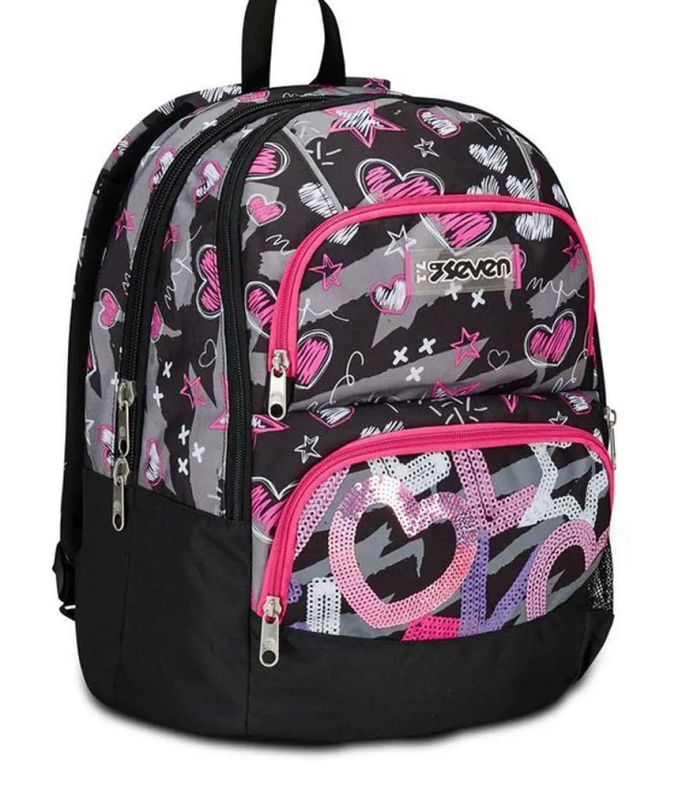 Zaino scuola Seven Advanced. Zaino realizzato in robusto poliestere, schienale in preformato e fondo integrato. Spallacci imbottiti e traspiranti, maniglia di servizio superiore. Tasca interna porta tablet/pc e tasca frontale organizzata per smartphone e piccoli oggetti. Tasche laterali chiuse da zip. Garanzia 4 anni.