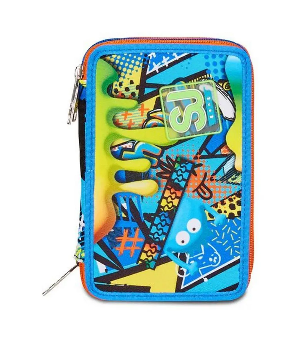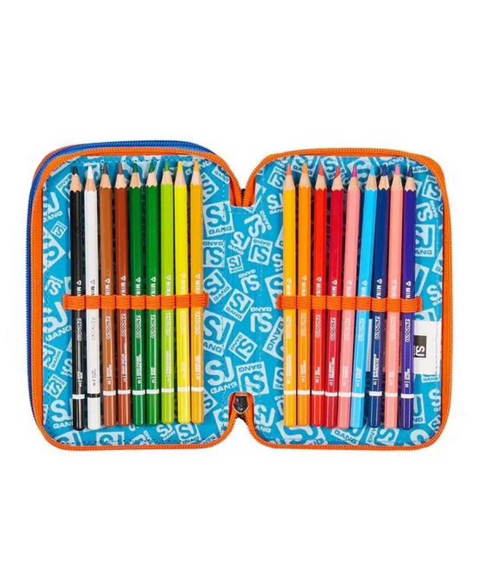 Astuccio per la scuola 3 zip SJ. Realizzato in robusto poliestere, con tre tasche principali chiuse da zip, complete di tutto l’occorrente per la scuola!