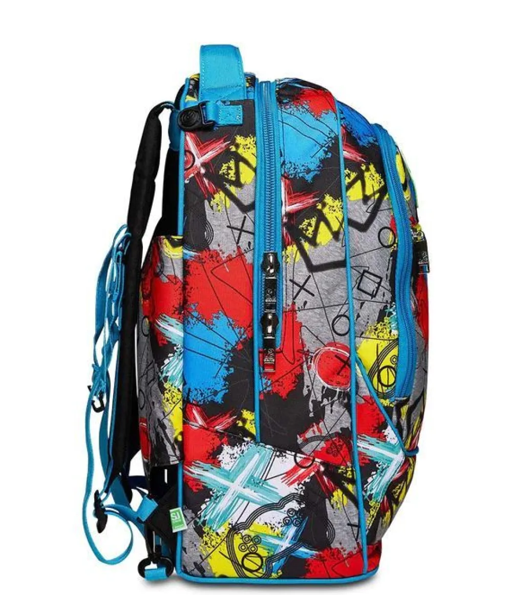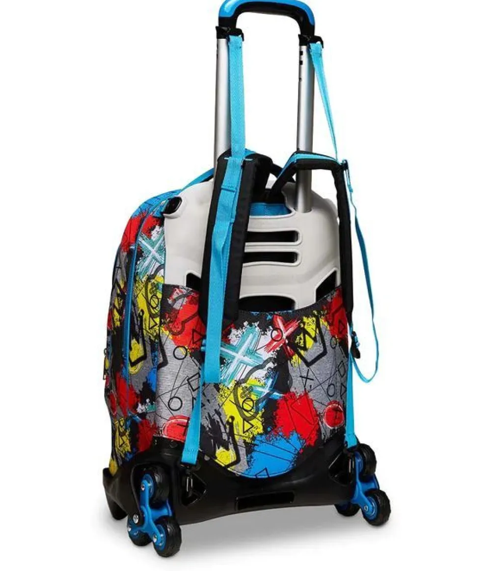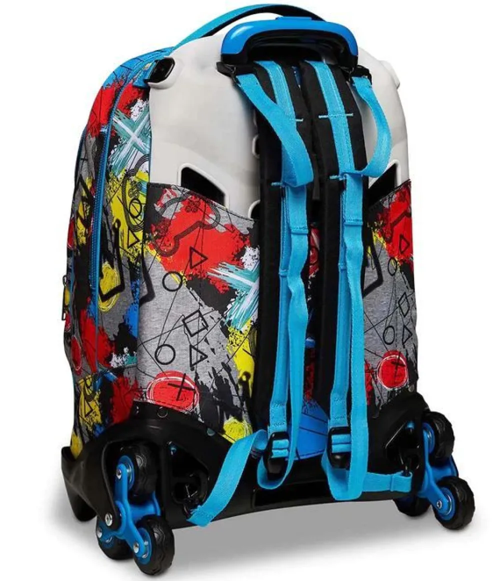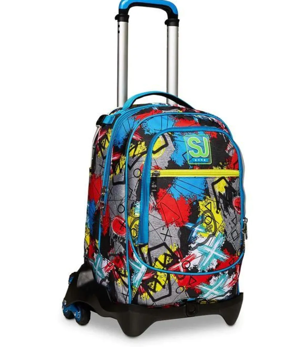 Trolley scuola SJ Jack 3 ruote. Zaino realizzato in robusto poliestere, schienale imbottito e rivestito in tessuto, spallacci imbottiti e traspiranti. Lo zaino Jack di SJ può essere comodamente sganciato dal carrello di traino in poche semplici mosse, per la pulizia o per la portabilità a zaino. Il carrello di traino è rinforzato con push botton, il fondo rigido e le grandi ruote gommate e silenziose garantiscono un trasporto semplice in ogni condizione. Dotato di sistema a 3 ruote per agevolare la salita dei gradini. Ampia tasca principale e tasca frontale chiuse da zip. Il Crossover System consente di trascinare il trolley senza sporcare gli spallacci: quando solleverai la barra telescopica di traino gli spallacci si alzeranno in maniera automatica!